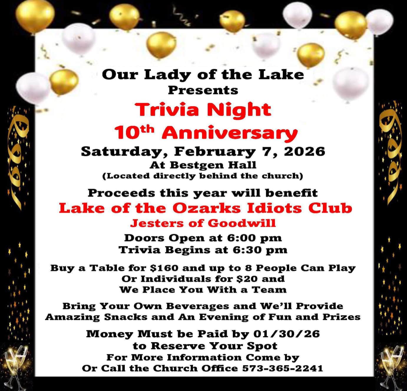 Trivia Night’s 10th Anniversary will benefit Lake of the Ozarks Idiot Club. Sign up by Jan. 30 for this fun and entertaining evening! Call or come by the office. 573-365-2241.